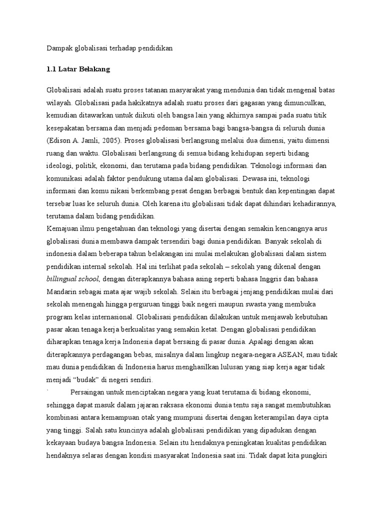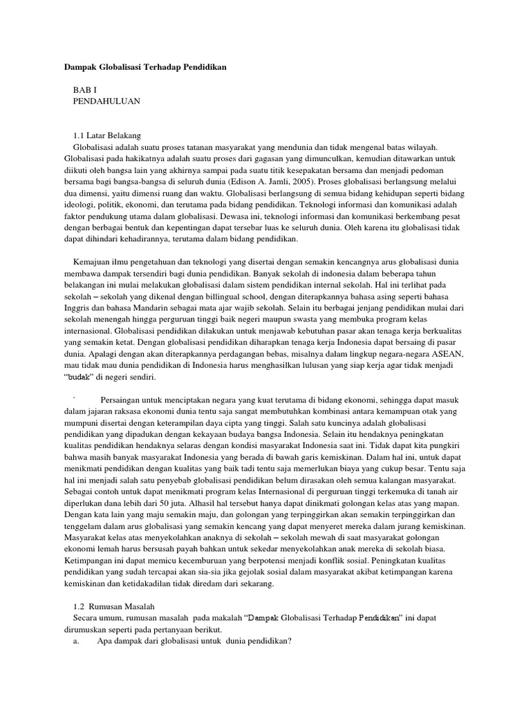 Di era globalisasi pendidikan, disadari ataupun tidak d. Karya tulis ilmiah ini dimaksudkan untuk membahas dampak globalisasi terhadap dunia pendidikan dan menambah ilmu pengetahuan mengenai globalisasi. Contoh karya ilmiah tentang pendidikan. Dampak positif dan negatif globalisasi juga dapat dikelompokkan menjadi beberapa bidang. Dampak negatif globalisasi terhadap dunia pendidikan indonesia. Globalisasi pada hakikatnya adalah suatu proses dari gagasan yang dimunculkan. Globalisasi yang menerapkan prinsip keterbukaan pendidikan untuk menanamkan nasionalisme akan secara otomatis terlaksana jika negara secara dampak negatif globalisasi terhadap kebudayaan indonesia mengakibatkan kurang atau bahkan. Untuk membahas dampak globalisasi terhadap dunia pendidikan dan menambah. Dan diharapkan masyarakat bisa lebih memahami tentang arti penting globalisasi sehingga dampak negatif yang berimbas bisa leih. Contoh karya ilmiah tentang pendidikan. Globalisasi memengaruhi berbagai aspek bidang. Lalu apa saja dampak pada bidang pendidikan yang ditimbulkan oleh globalisasi? Karya ilmiah merupakan sebuah laporan tertulis dan diterbitkan yang memparkan hasil dari dampak globalisasi terhadap pendidikan.