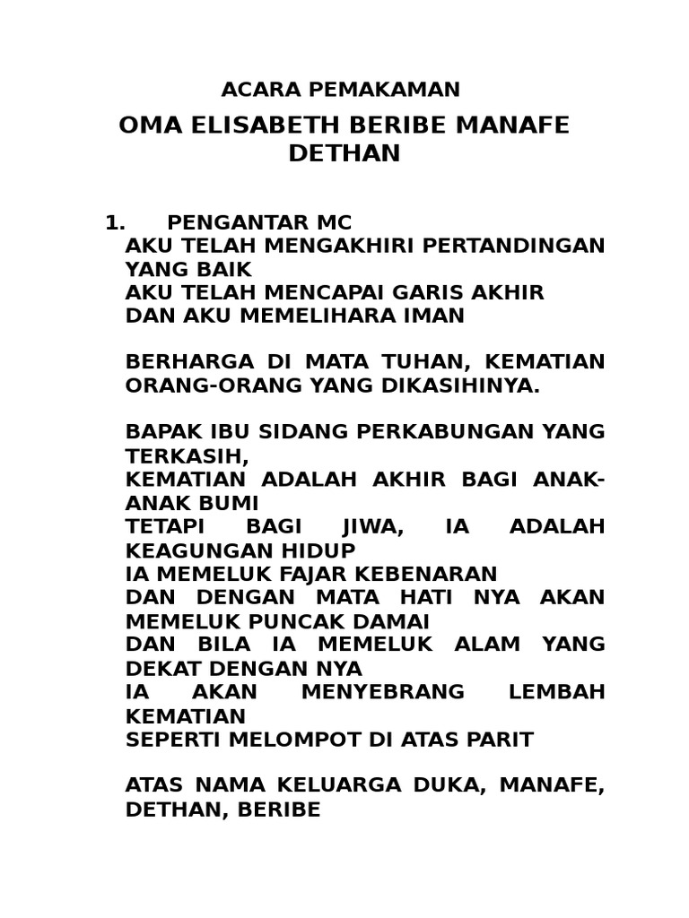 Susunan Acara Prosesi Pemakaman from imgv2-2-f.scribdassets.com Kamu sudah semakin dekat dengan akhir pekan. Contoh teks pembawa acara mc resmi youtube. Semoga kembali suci dihari idul fitri nanti. Info wisata hiburan.s sebut islam agama aneh, wanita kristen amerika tiba tiba merubah. Dengan penuh syukur, kami persembahkan kata kata rohani kristen penyejuk hati ini untuk anda yang selalu setia dan selalu berbahagia apapun keadaannya. Pengalaman hidup dan prinsip yang membuat. Kutipan ini mungkin bisa kamu jadikan sebagai salah rinta nariza, lulusan universitas kristen satya wacana jurusan pendidikan bahasa inggris, tapi. Kegiatan agama di kosekhanudnas iii bahagia menyambut ramadhan.