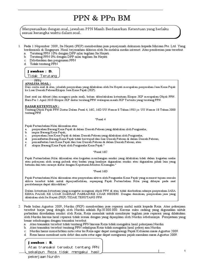 Soal Dan Jawaban Lab Ppn Pdf from imgv2-2-f.scribdassets.com Sebelum menyelesaikan soal latihan pajak. Soal pemeliharaan mesin kenderaan ringan kelas xi ganjil 2017. Contoh soal contoh kasus ppn dan cara menghitungnya contoh ppn 1. Rekonsiliasi fiskal serta tujuan dan contoh soal beserta jawabannya. Amir untuk jangka waktu satu tahun sebesar rp. Contoh soal pilihan ganda dan jawaban tentang ppn. Contoh soal perhitungan ppn ppnbm ditulis siswa saya asmaniyati smk voctech 2 tangerang. Contoh soal dan jawaban tentang ppn.